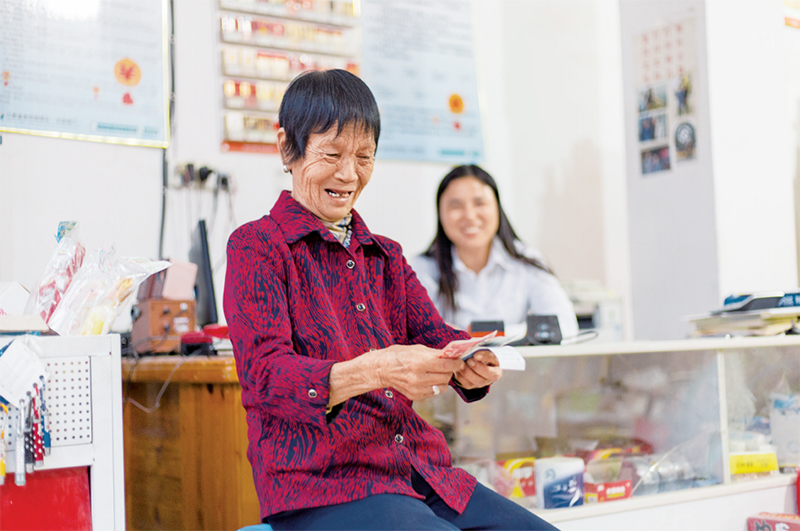 我國成功建設(shè)了具有鮮明中國特色、世界上規(guī)模最大、功能完備的社會保障體系。圖為江西省遂川縣草林鎮(zhèn)拱前村82歲脫貧戶黃茂香在“社保村村通金融服務(wù)便民點”支取養(yǎng)老金,該縣在286個村設(shè)立此類便民點,實現(xiàn)了所有老人不出村就可輕松支取?!≈袊鐣U想s志社供圖 高敏/攝