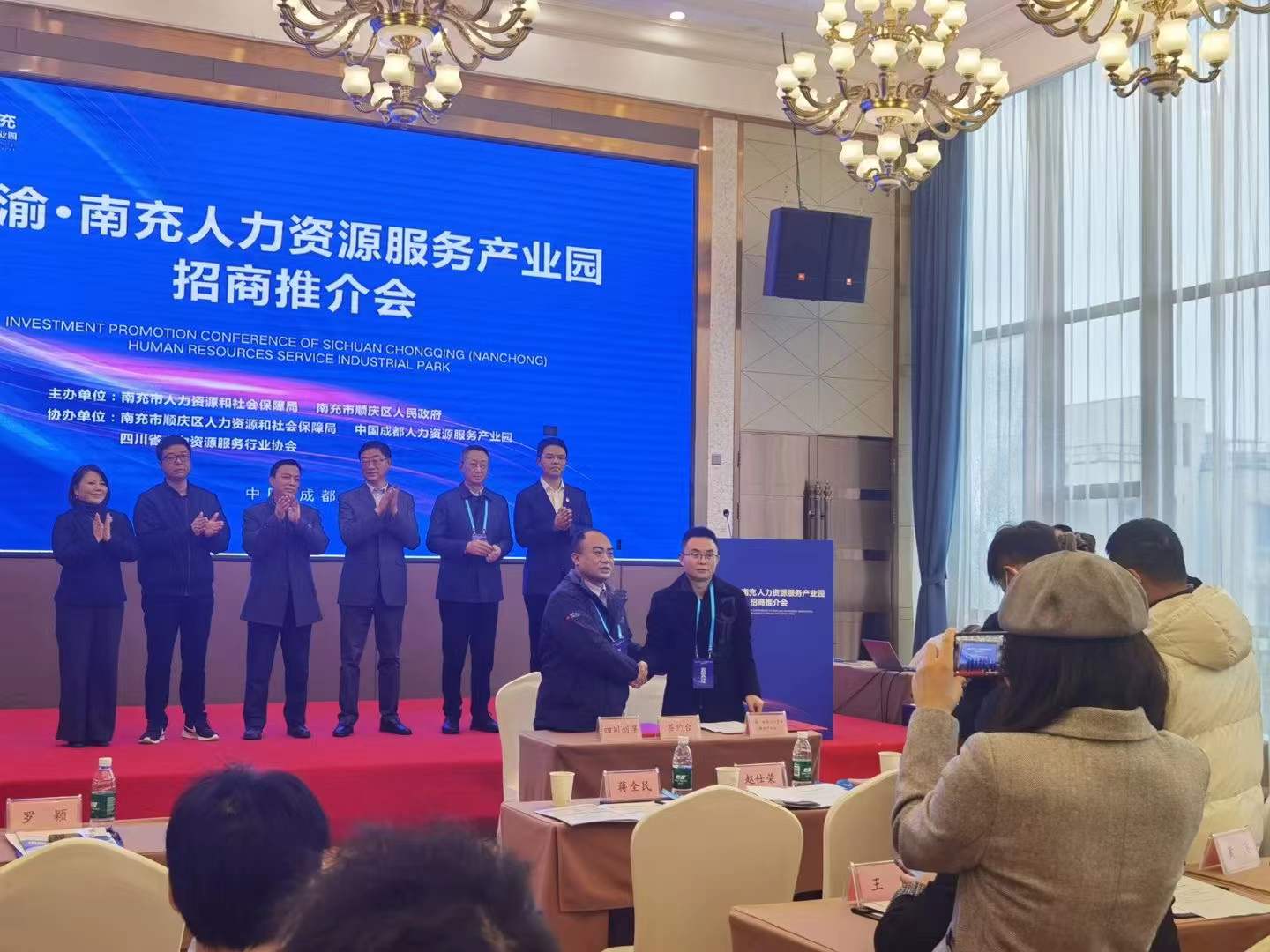 “集聚平臺,促發(fā)展”12月16日,川渝·南充人力資源服務(wù)產(chǎn)業(yè)園招商推介會在成都成功舉行。會上我司李明李總與南充市人力資源服務(wù)產(chǎn)業(yè)園簽訂了入園協(xié)議。